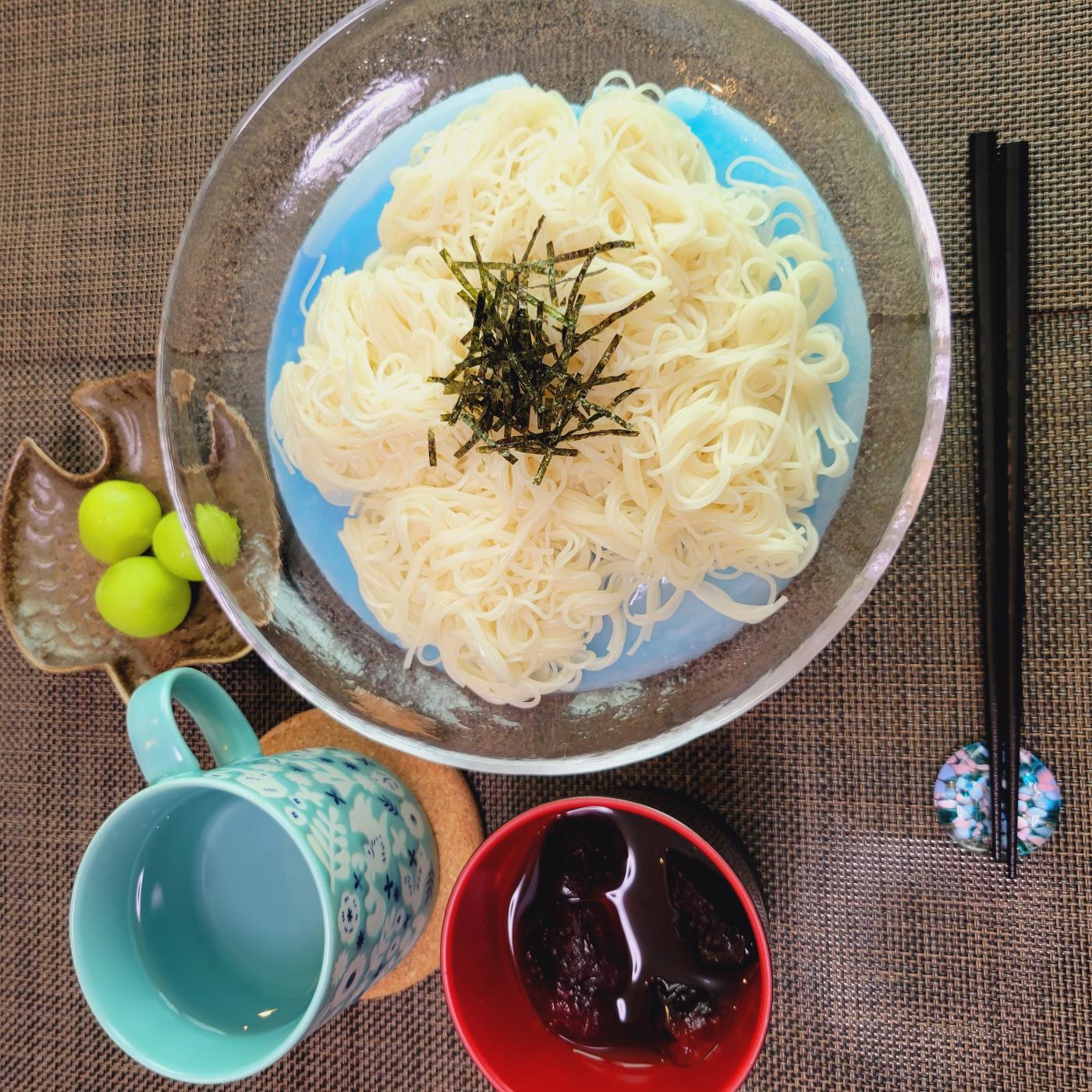 ガラスのお皿の上も冷たいし、素麺も冷え冷えです。