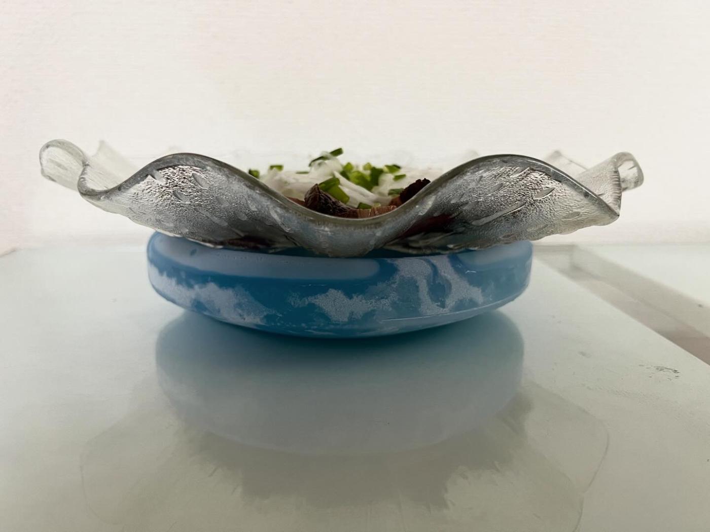冷凍庫で8時間以上凍らせて、食事をする際にテーブルに出し、その上に料理がのったお皿をのせます。