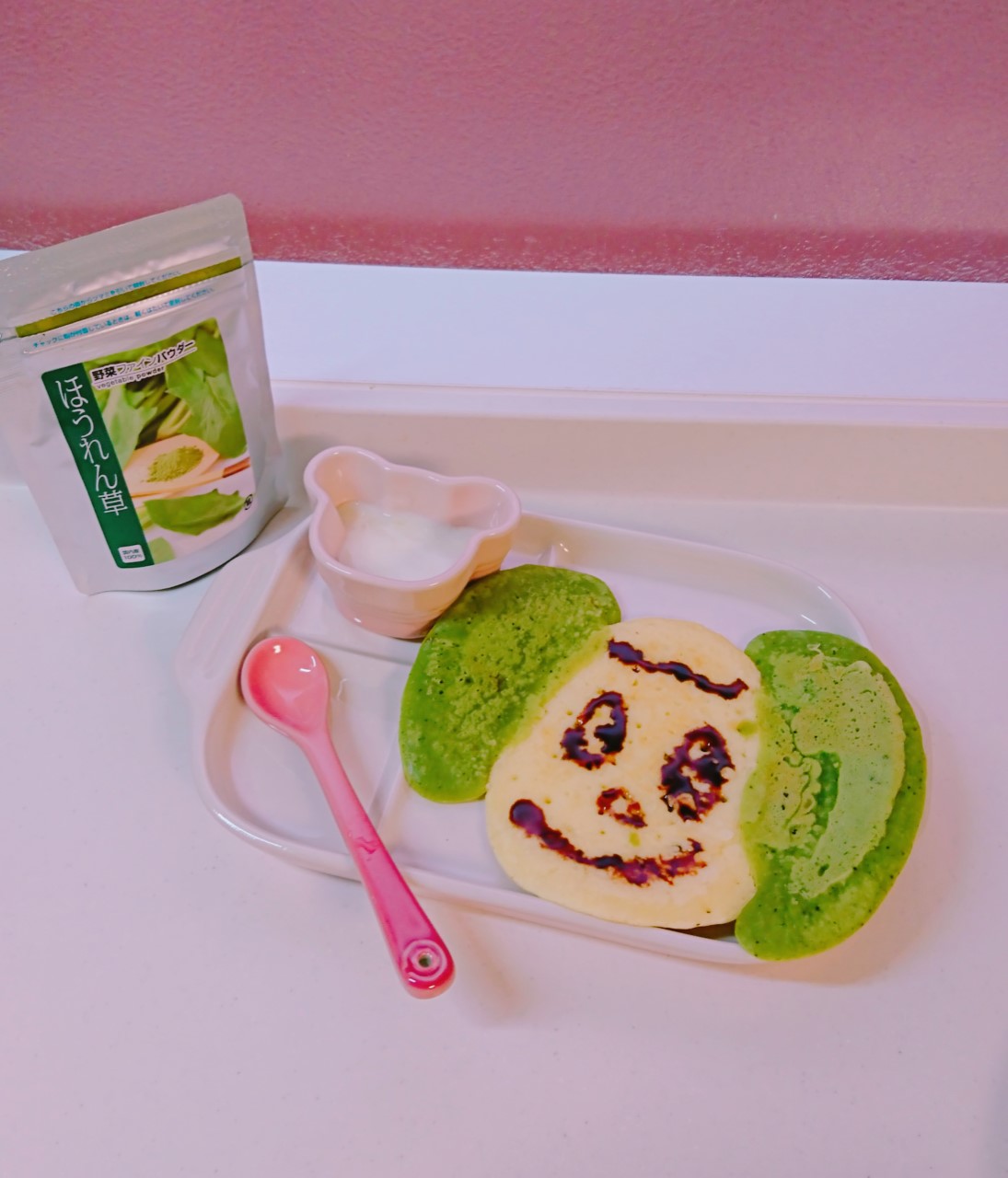 そんな娘にほうれん草パウダーを使ってパンケーキを焼いてみました♪