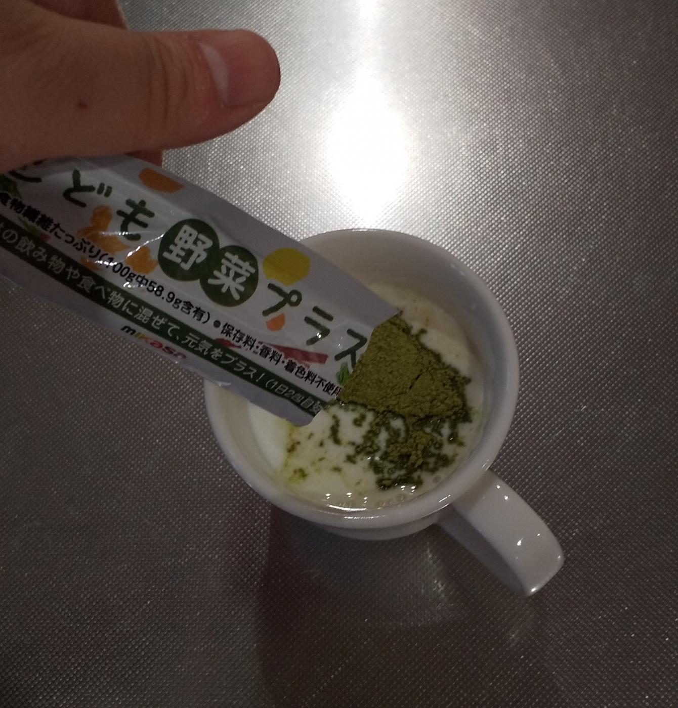 こどもに必要な野菜の摂取量、本当に足りてますか?と問われると私は自信をもって返事をできませんでした。こども自身も野菜に対する苦手意識が強くなかなか食べてくれません。また食べやすいように細かく刻むのも一苦労です。そうして頑張って作っても「いらない」の一言で食べてもらえないことも多かったりします。他にも便秘で辛そうな子やお肉中心の偏食生活を直さないと、など悩みは尽きません。そんな方にこそおすすめの「こども野菜プラス」普段の生活で不足しがちな食物繊維、ビタミン、ミネラル3つの栄養素がまるごと摂れます。さっそく食べさせてみたくて牛乳に混ぜてみました。最初はダマになって浮いていますが徐々に溶けていきます。うっすら緑色に色づいていますがこどもはゴクゴクと飲み干してしまいました。あれだけ苦労していた野菜への苦手意識は全くないようです。他にもオレンジジュースに混ぜるとさらに飲みやすくなります。見た目は緑色になりますが、オレンジジュースの味が飲みやすくしてくれるので私はこちらの飲み方も好きです。パウダー状になっているのでさっと入れるだけなのがお手軽でとても魅力的です。スティック状で一袋に2gずつ個別包装されているので清潔で使いやすく、持ち運びやすいのも使いやすいポイントだと思います。