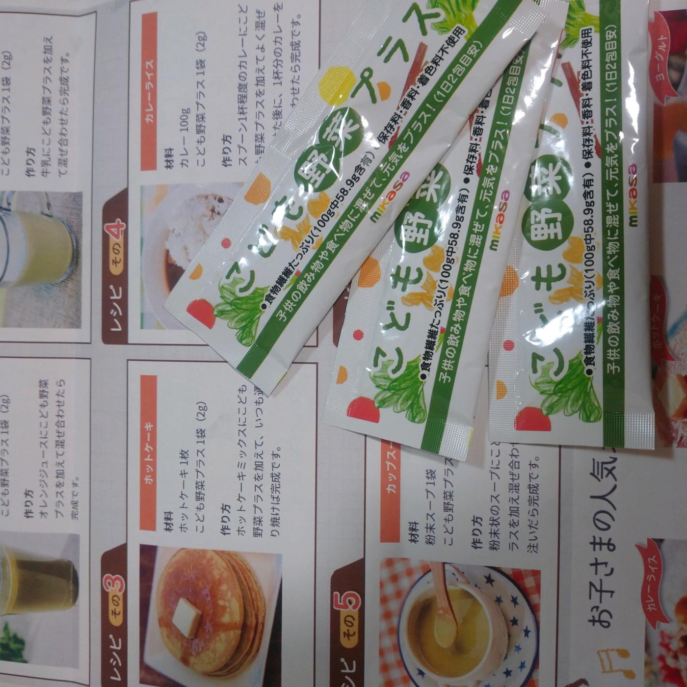 お試しは牛乳に混ぜるだけしかしていないのですが、ホットケーキなどにも混ぜて楽しく美味しく野菜を摂らせてあげようと思います。