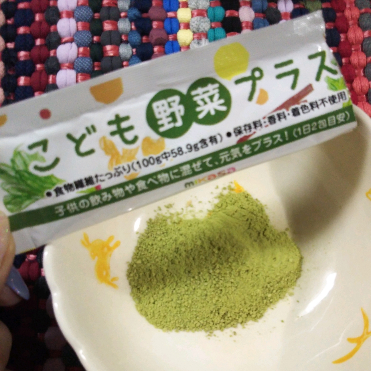 子供の飲み物や食べ物に混ぜて元気をプラス!成長期の子供に不足しがちな栄養をまるごとサポート!東京大学医学部附属病院小児科医、赤坂ファミリークリニック院長の伊藤明子先生監修。子供に不足しがちなビタミン、ミネラル、食物繊維を野菜とともにサポート!スティックタイプで1日2包。可愛らしいパッケージ。サラサラなパウダータイプ。野菜感満載の緑色のパウダーです。加熱調理いらずで混ぜ合わせるだけでいいので、飲み物に混ぜたり、ヨーグルトにかけたり、ホットケーキ、カレーライスなど子供の大好きなレシピが豊富に使用できます。子供って好きな野菜しか食べなかったり、気分で野菜は残す事も多いから、野菜不足はすごく悩み。我が家の5歳の息子は朝が弱くて、フルワークの私には朝食がすごく悩み。ダラダラ食べるし、ほとんど残す…。でも最近お気に入りなのか、チョコマーブルパンとスープにはまってて、サラダも食べてほしいけど食べてくれない、時間に余裕のある夕食でしか野菜摂取がうまくできない事が多いからこども野菜プラスは大助かり。スープに入れれる!今日はカボチャスープ作って仕上げにかけるだけの手軽さ。色は緑が残っちゃうけど味の変化がないので子供も嫌がらずに間食してくれます。1包でミネラルもビタミンも食物繊維も3つの栄養素がまるごと摂取できるし、安心の国産野菜使用だし、1日2包で必要野菜が摂取できるから私のイライラや不安も減る!!子供も嫌がらないし、本当に手軽!スープじゃなくても牛乳に混ぜても飲んでくれるから忙しい朝も大助かりです。飲ませるようにしてから、最近うんちの形がきれいなんだよ。って報告もあり、健康に本当にぴったり。これからも継続したい商品です。野菜が苦手な子供にすごくおススメです。