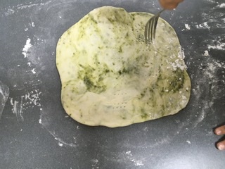 ④クッキングシートの上で生地を伸ばしてトッピングする。