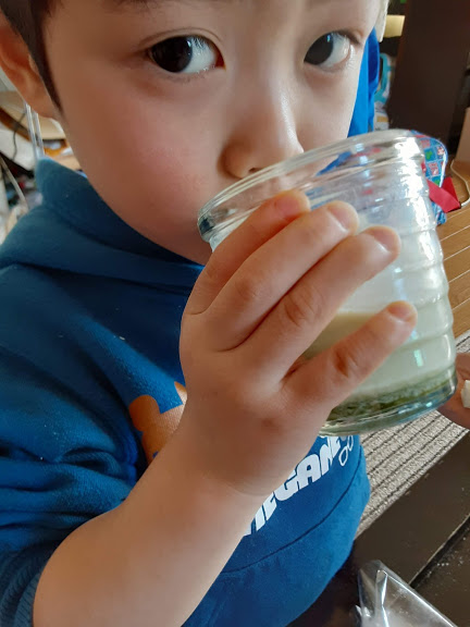 普段飲む青汁よりも青臭さが少ないのと、気持ち甘めなのか、おいしい!と言ってごくごく・・・。