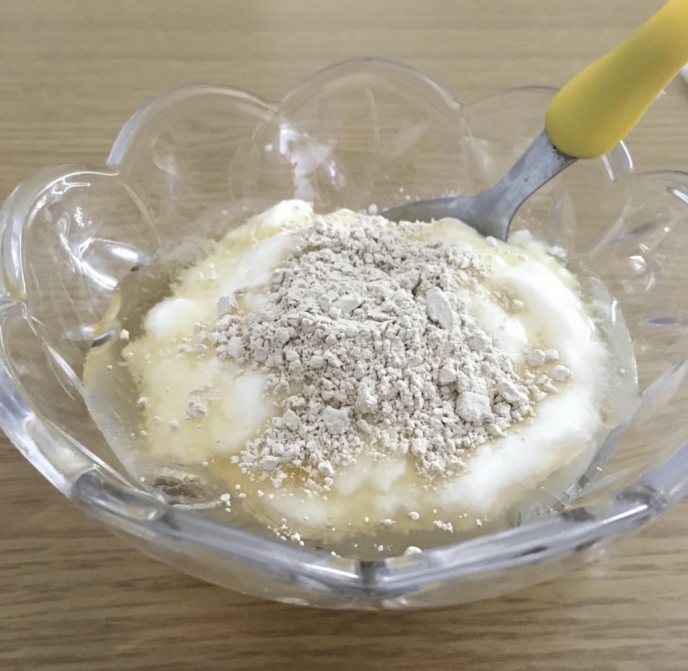 画像ではわかりやすいように上からかけてるけども、ヨーグルトにパウダーを混ぜちゃえば味もわからないし、いつものヨーグルトだと思って食べてくれます。