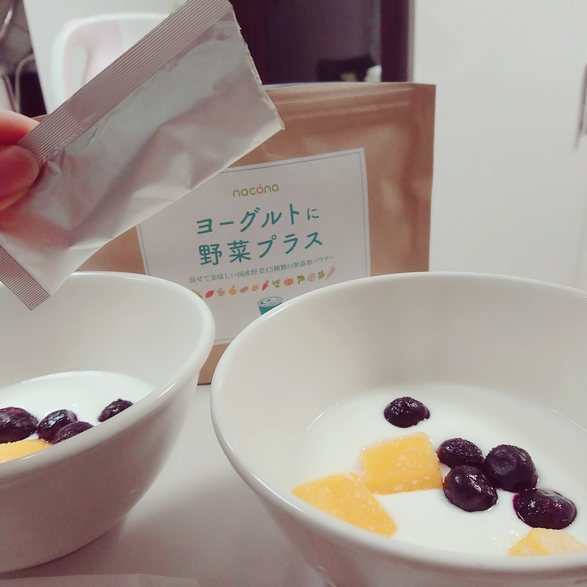 私はヨーグルトには、いつも大好きなマンゴーとブルーベリーを入れて、そこにこの「ヨーグルトに野菜プラス」を混ぜて頂いているよ。