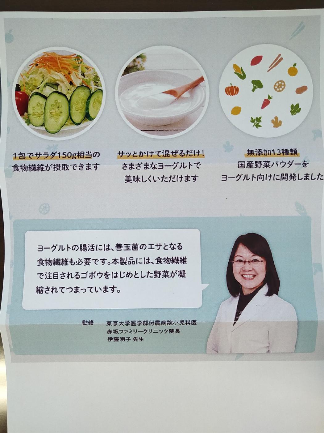 特に食物繊維が豊富と言われるゴボウを多く含んだパウダーで、その他の国産野菜もヨーグルト向けに開発されているのでだまになりにくく栄養素が凝縮されて詰まっていて、ヨーグルトの甘味と酸味にベストマッチしたお味で美味しく頂けるのです。
