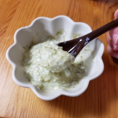 最初は緑色の見た目に「やだー」と言ってたんですが、一口食べさせたらパッと目を見開いて自分から何度もパクパク♡