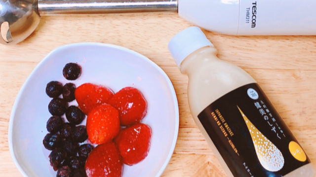 わたしは、毎朝、フルーツやヨーグルト、豆乳などのスムージーをのんでいます。この甘酒のレモン味をいちご、ブルーベリー、ヨーグルトと、スムージーにしてみました✩⋆*॰¨̮⋆。˚