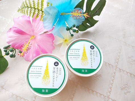 自社栽培米と、京都利休園の茶葉を使用し、素材の風味にこだわったからだに優しい甘酒ミルクアイスです。