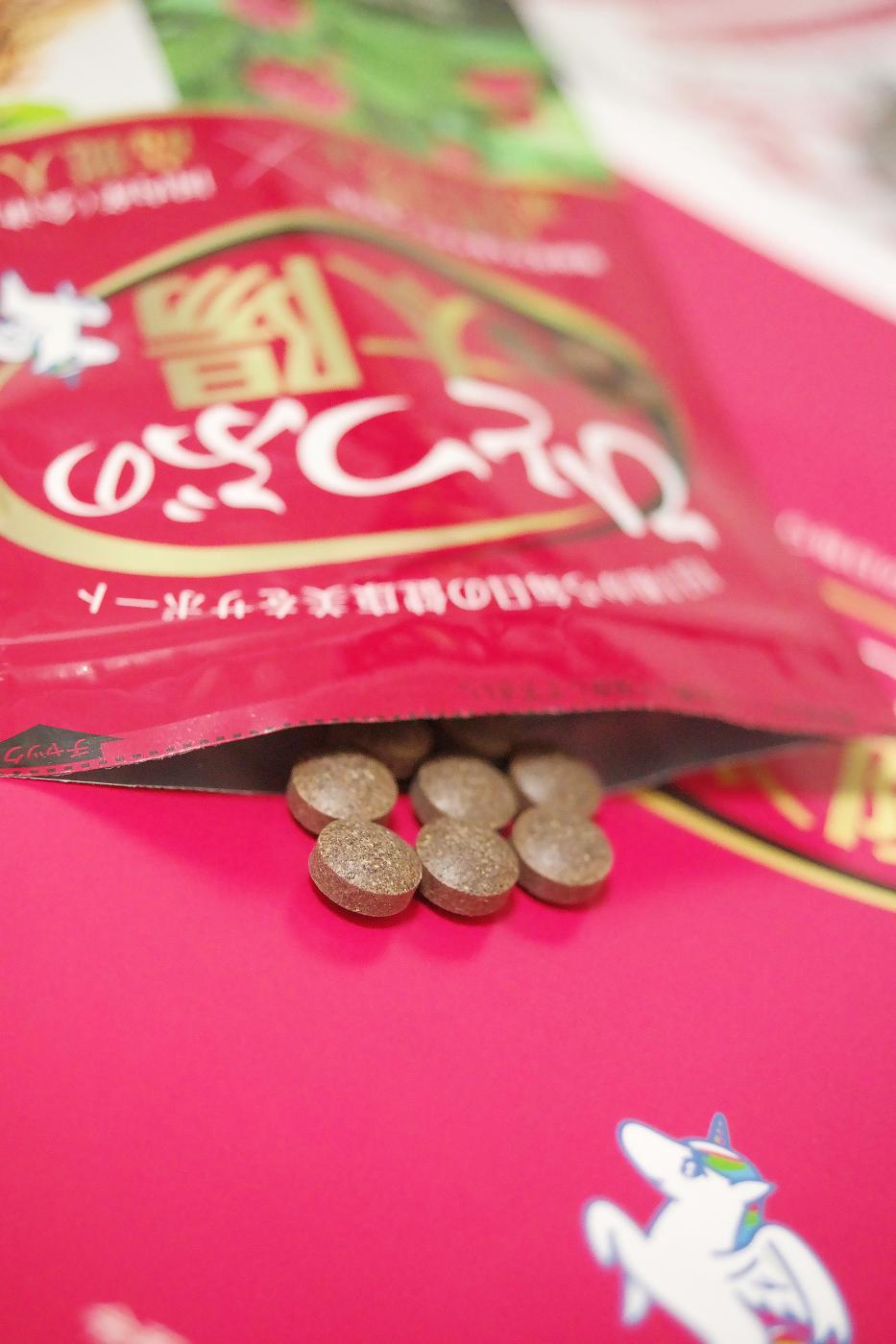 黒っぽい(濃い茶色っぽい)錠剤になります。