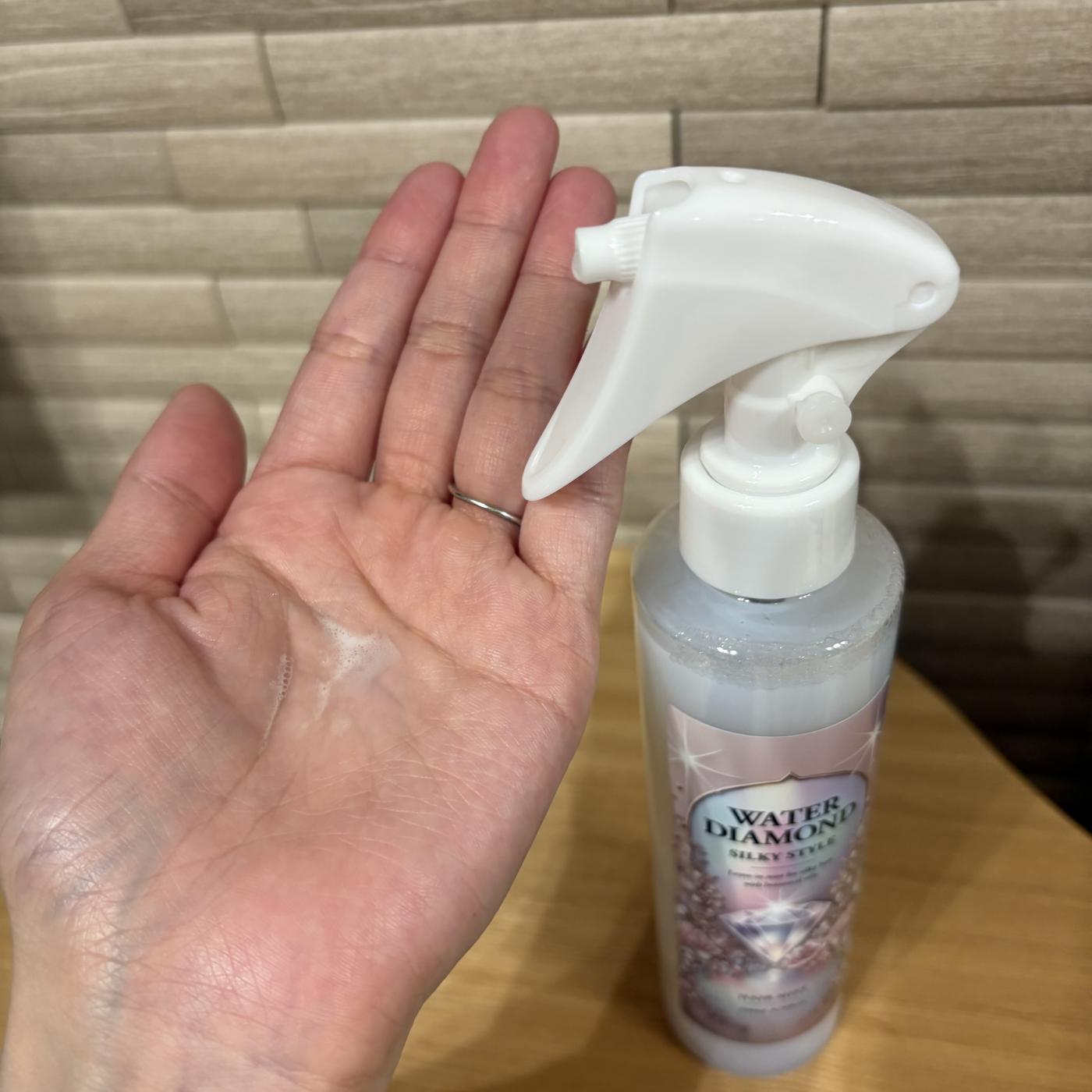 お風呂上がり、タオルドライした髪に「ウォーターダイヤモンド シルキースタイル」をシュッシュとスプレ...