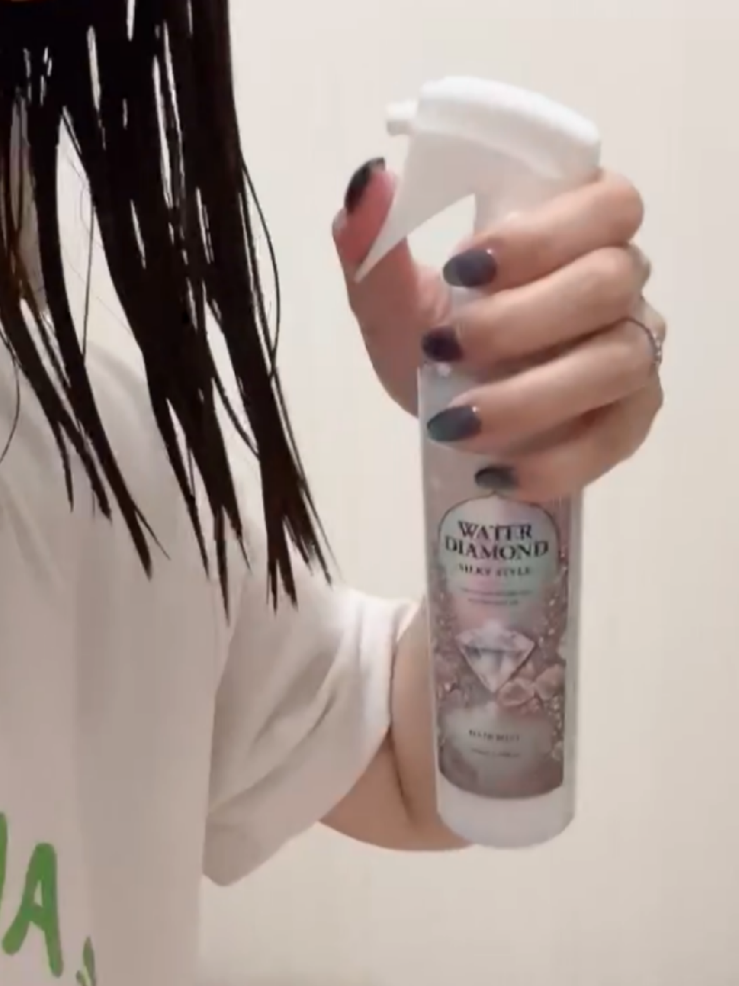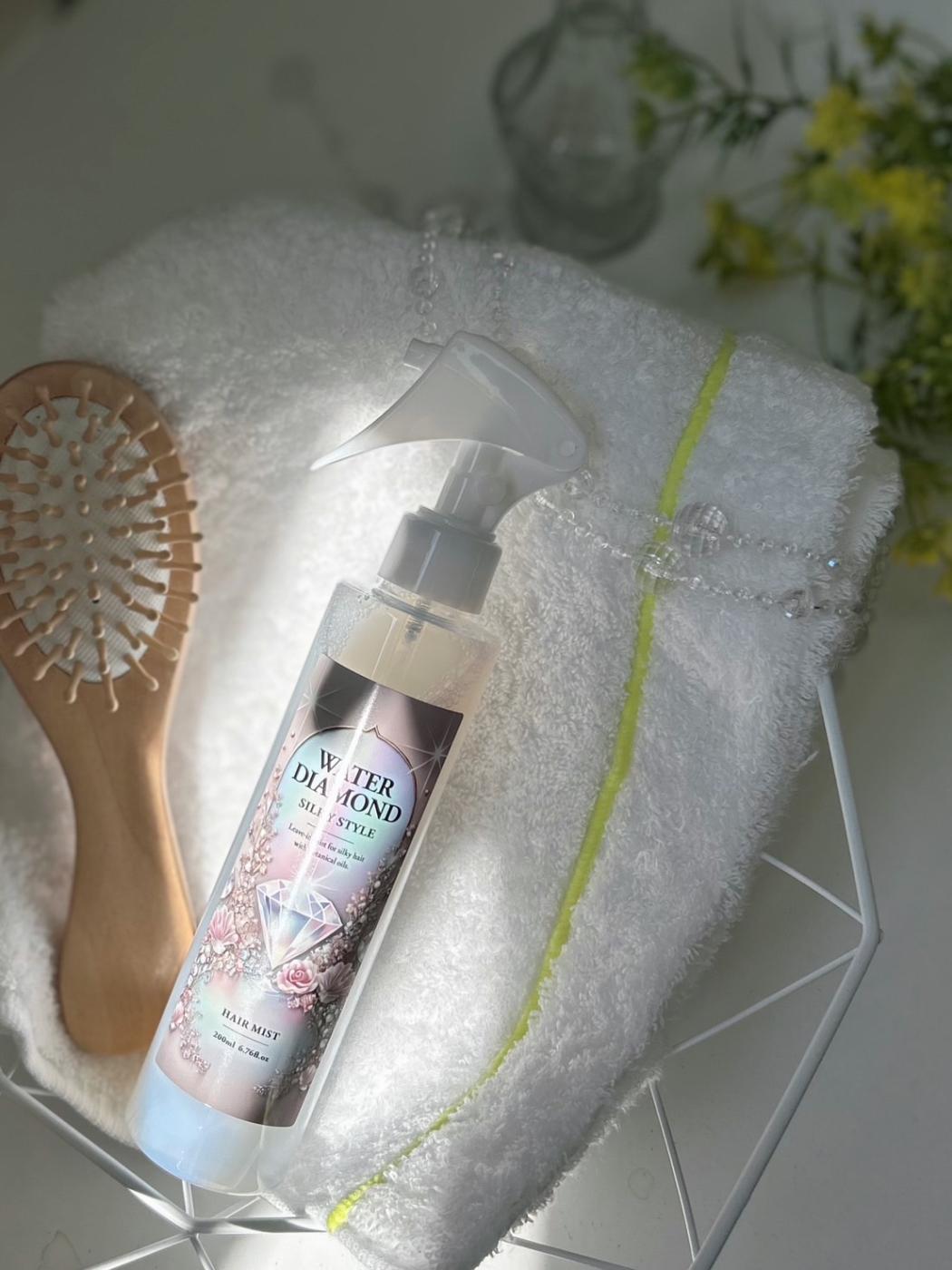 使用方法はシャンプー後タオルドライした髪の毛にまんべんなくプッシュして、【ウォーターダイヤモンド シルキースタイル】を吹きかけます!