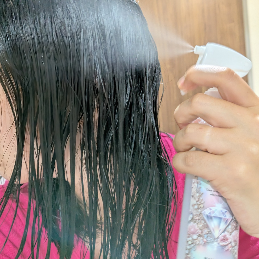 お風呂上がり、タオルドライした髪に「ウォーターダイヤモンド シルキースタイル」をシュッシュとスプレ...