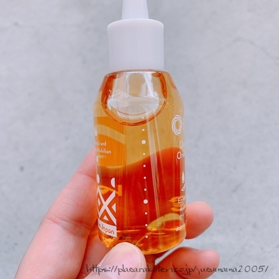 透明な小さなボトルに入っていてオレンジ色は液体の色。