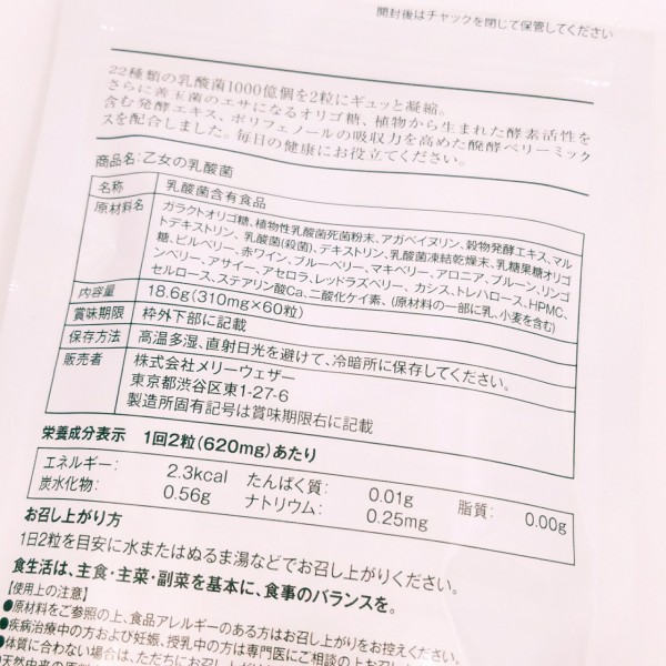 また、代謝をサポートする生きてる酵素、美容成分ポリフェノールが入っています。健康・ダイエット・美容に効果的なこの乙女の乳酸菌、飲んでいると体はスッキリするし、お通じがよくなるので肌の調子もいいし、代謝アップで太らないのでとても重宝しています。まさに大人女子のためのサプリメント、飲み続けたいなぁと思いました。