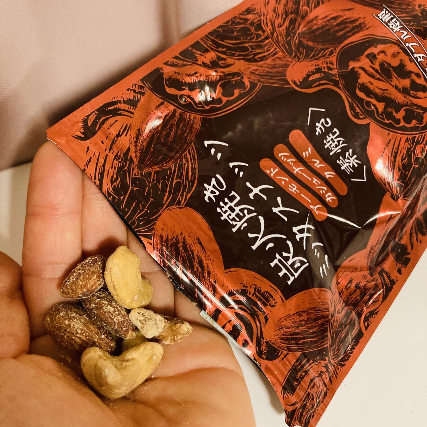こちら、今回の炭火焼きミックスナッツは、まず一粒食べた瞬間に「素材で食べさせるナッツ」だなと感じました。袋を開けた途端、ナッツの香りがふわっと広がり、ただのローストナッツとは断然に明らかに違うような、ワイルドな印象がありますね。