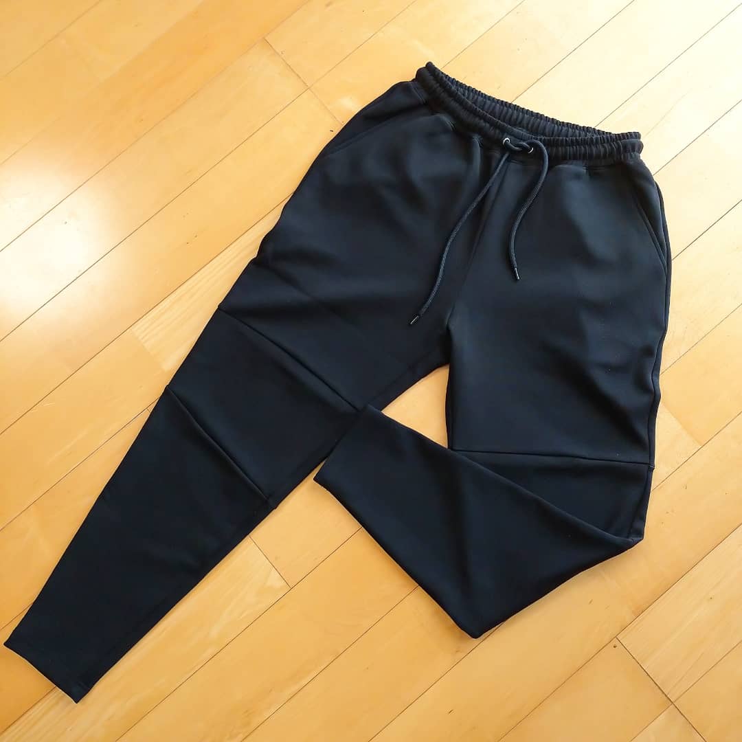 裾にリブがなく、ウエスト部分に紐がついているので、体型に合わせて調節可能です。膝下からタイトなシルエットになっているので、スマートなラインに映ります。シンプルでカジュアル感がありながらも高見えし、かつ機能的なデザインになっています💡