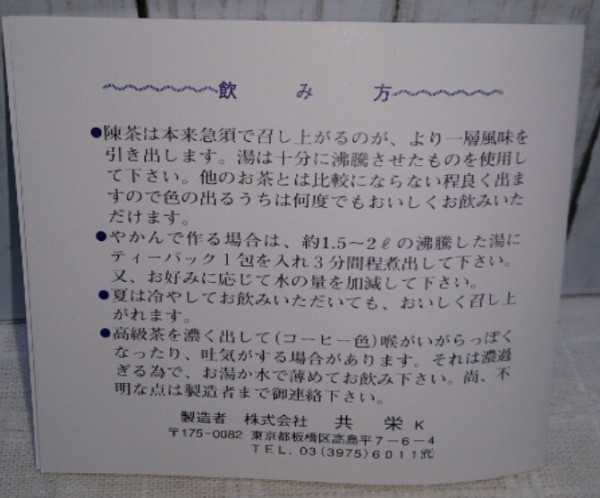 ・陳茶は本来急須で召し上がるのが、より一層風味を引き出します。湯は十分に沸騰させたものを使用して下さい。他のお茶とは比較にならない程良く出ますので色の出るうちは何度でもおいしくお飲みいただけます。