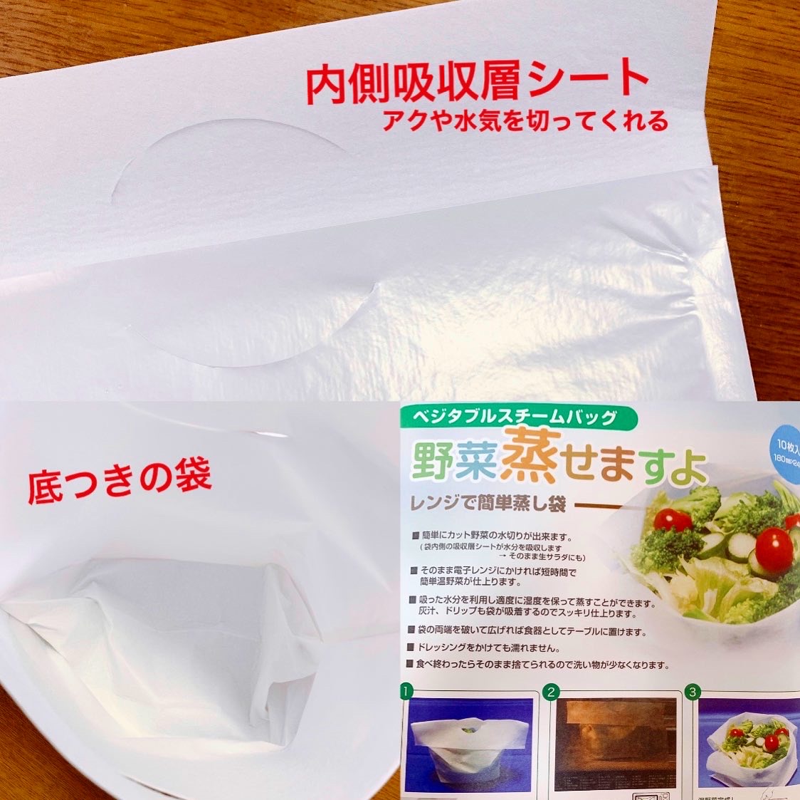 袋の内側は吸水シートになっているので水切りしてくれたり、アクを取ってくれたり、丁度良い湿度を保ちながら蒸してくれるので美味しい温野菜が出来上がります!