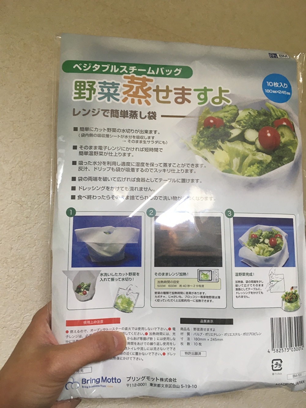 バックのなかに蒸したいお野菜などを入れて、レンジでチンするだけでいいので、とても簡単でいいです。