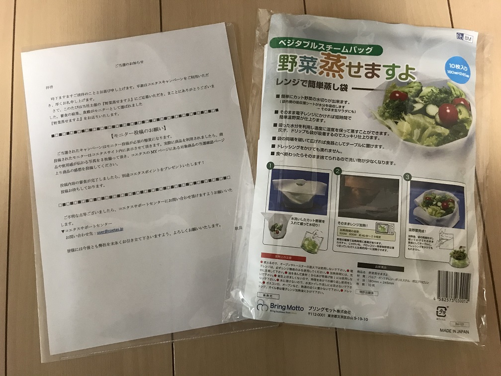 コエタスさんより、ベジタブルスチームバッグ「野菜蒸せますよ」5袋入りをいただきました☆彡