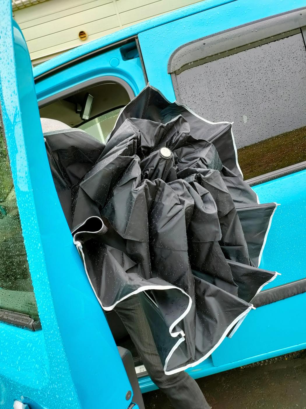 私が特に気に入っているのが、逆折りに畳まること。これ不便に思っていた "あの状況" の対策に最適なんです。それは車に乗る時に車内が濡れない仕様!!