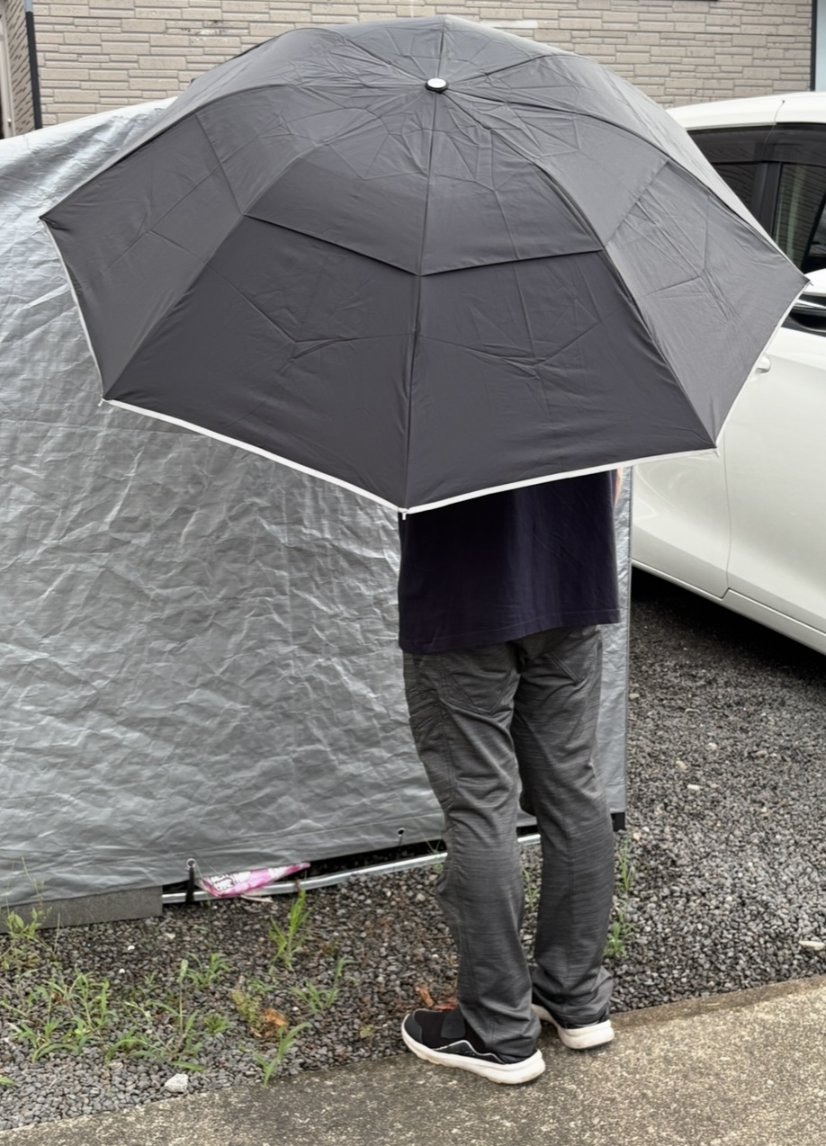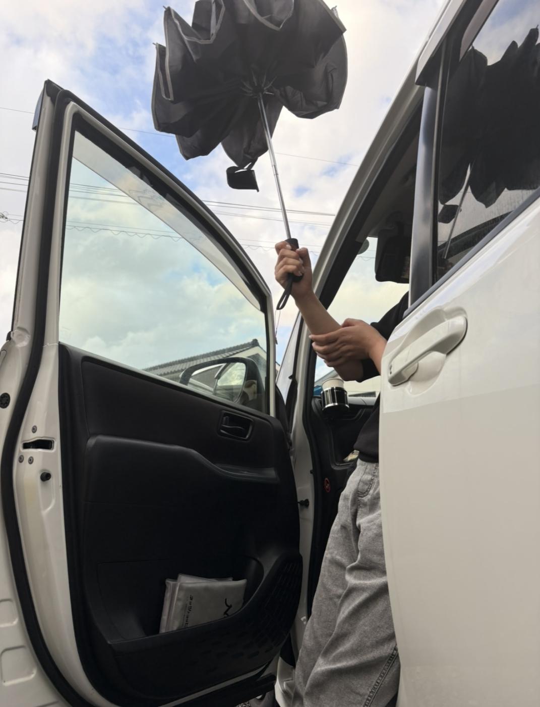 雨の日、車でお出かけの時、一緒に傘に入り子どもを乗せた後、自分も車に乗り、ワンプッシュで傘が閉じて、写真のように逆向きに閉じるので、雨がポトポト落ちずに車内が濡れないのはめちゃくちゃいいです。よく考えられている傘だなぁーと思いました!