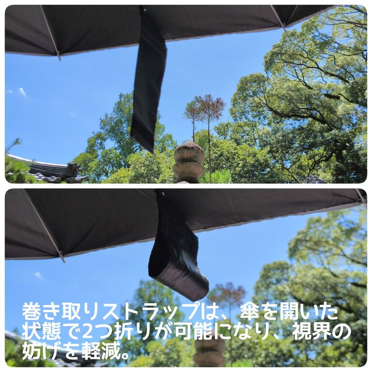 巻き取りストラップに面ファスナーを追加:傘を開いた状態で2つ折りが可能になり、視界の妨げを軽減。