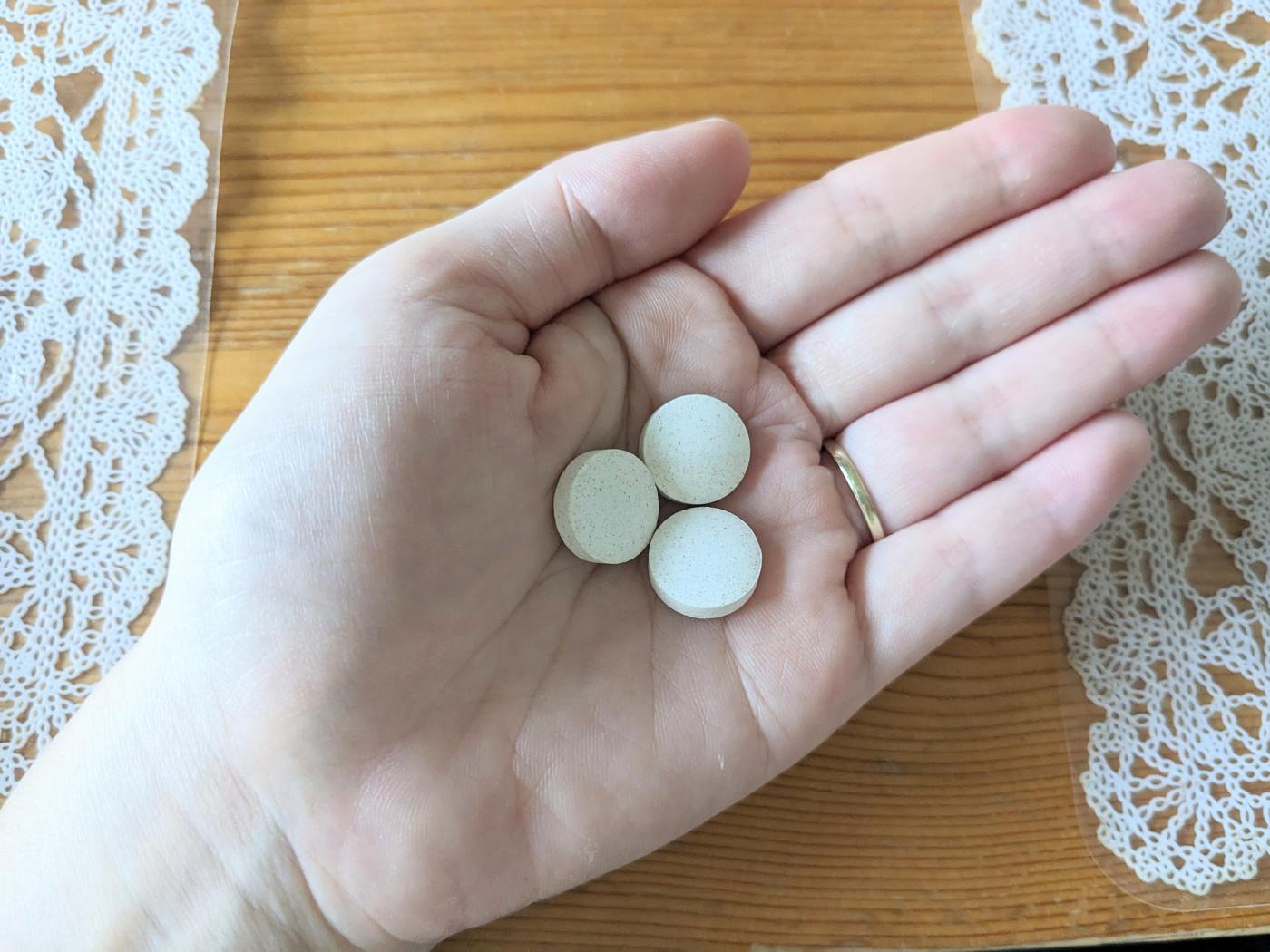 タブレットは一般的なものより少し大きいですが、硬すぎず、噛むとホロホロと崩れて食べやすいです。