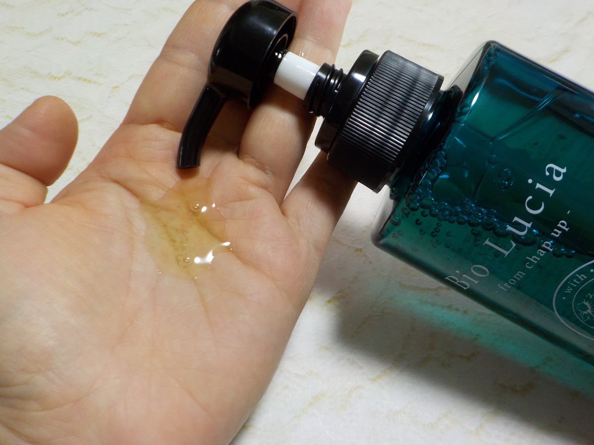 使ってみたところ、ちょっと薄い黄緑がかった透明のもっちりとしたシャンプー。泡立ちもよく、いい感じです。