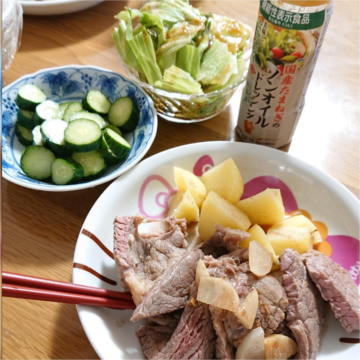 夕飯は~豚野菜のポン酢炒めにしました。サラダには国産たまねぎドレッシングをかけました♪