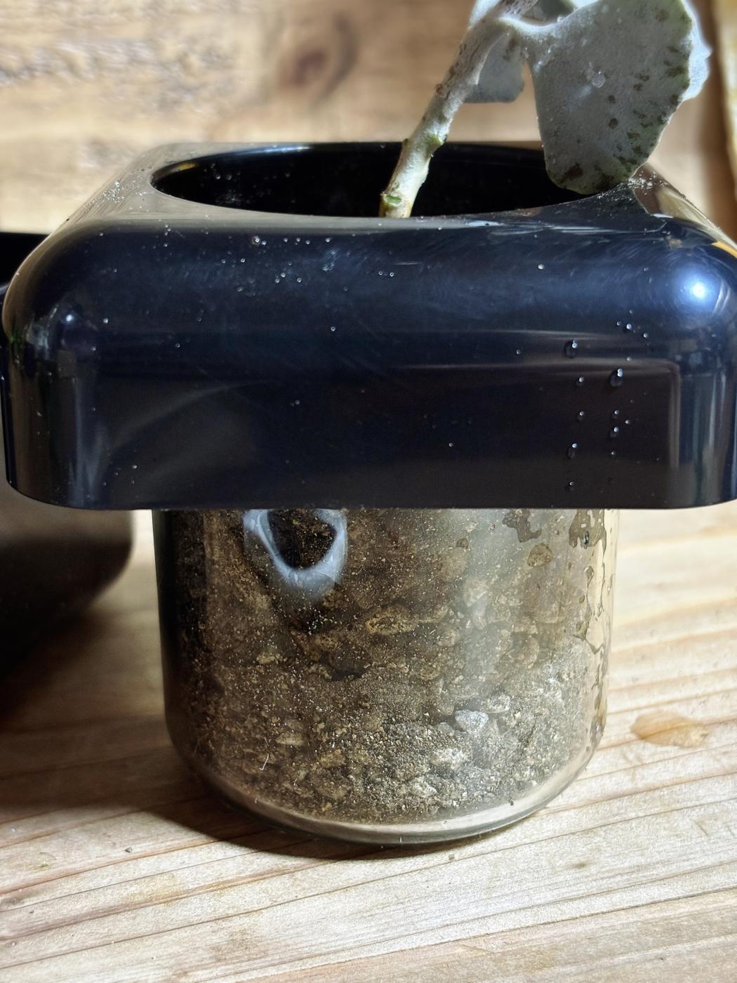 透明なポット部分は光が当たらない二重構造になっているので、ポット内部に苔が発生しないような構造になっています。