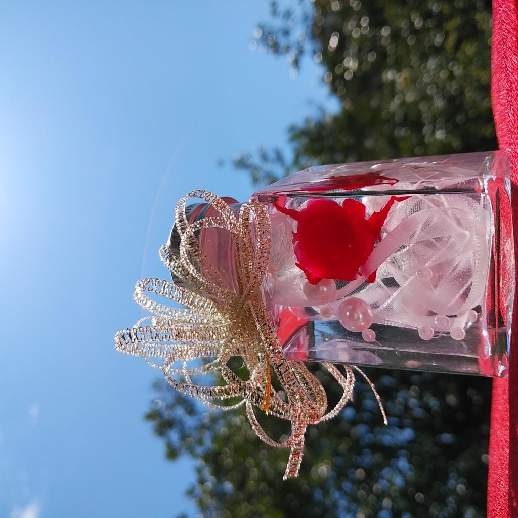 白いリボン、ビーズ、小さな薔薇の花が閉じ込められています!