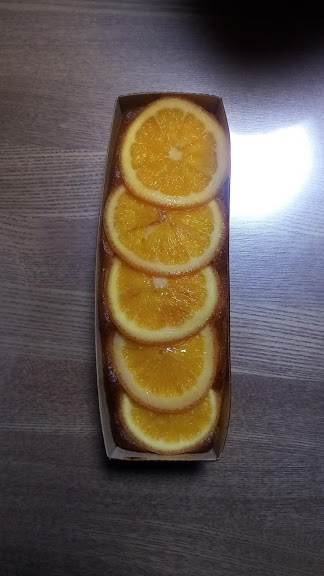 丸くカットされたオレンジが重ねて並んでいて、 目にも嬉しいパウンドケーキです。 お味は、しっと...