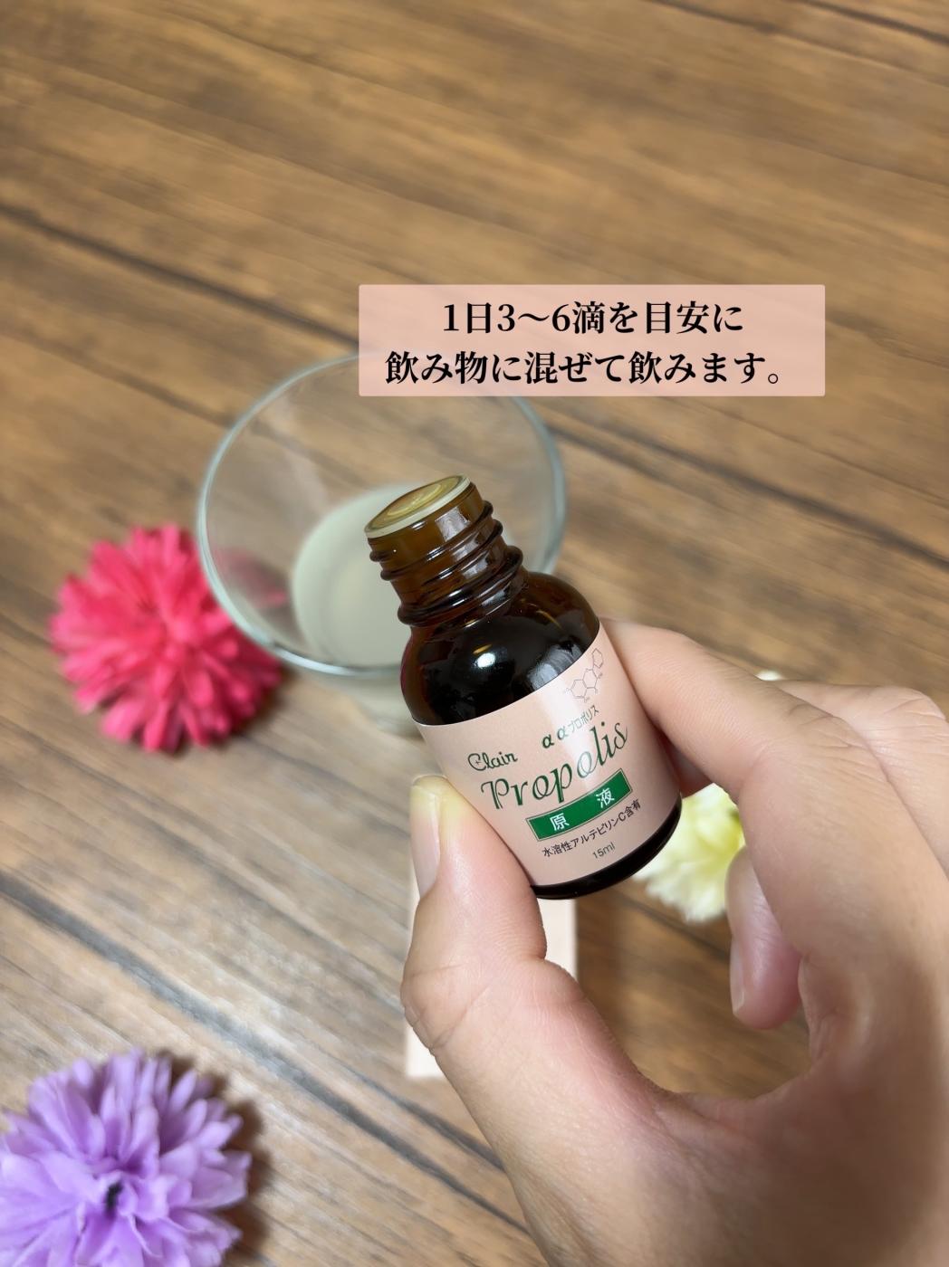 くれえるのプロポリスは1日2.3滴お好きな飲み物に混ぜて1日かけて身体に巡らせるのがオススメ✨️