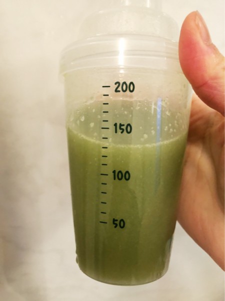 お水に混ぜてみると、ドロッとしたグリーン色のスムージーです。