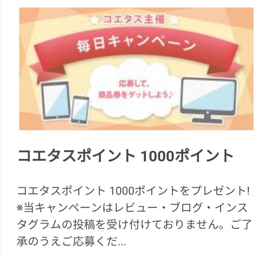 このキャンペーンのおかげで、コエタスへの意気込みがハイパー上がりました!!まだまだ初心者ですが、楽しみながらポイント集めていきたいって思いました♡