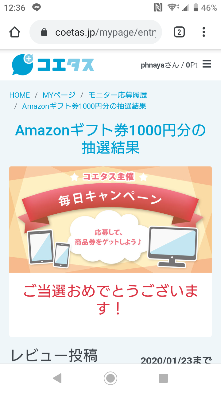 登録してまだ3日なのに、いきなり当たって驚きました。毎日コツコツやっていこうと思った矢先で、とても嬉しかったです。