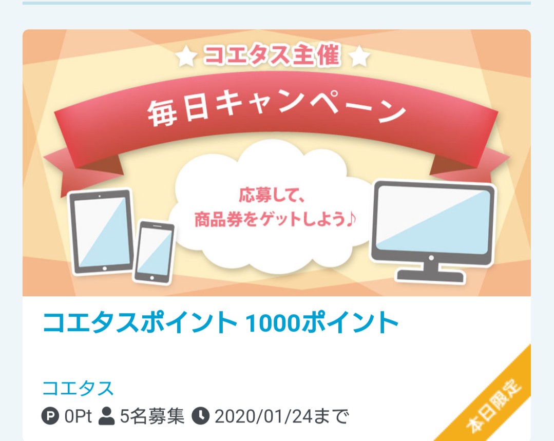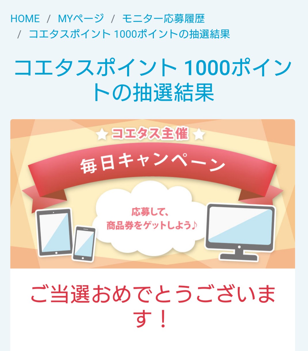 コエタスを初めてまだ数週間。 体験したい物はいろいろあるけど当選は難しいかなと思いながら頑張って...