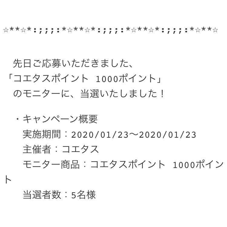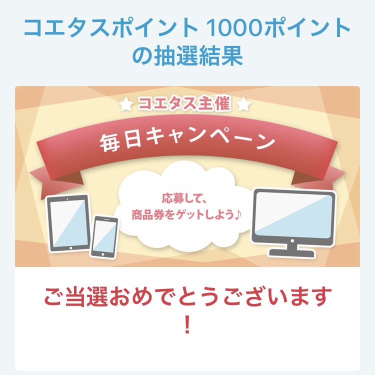 初めて毎日キャンペーンに応募して、コエタスポイント1000ポイントが当たりました。