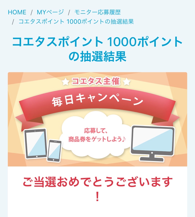 コエタスポイント1000ポイント当たった(о´∀`о)
