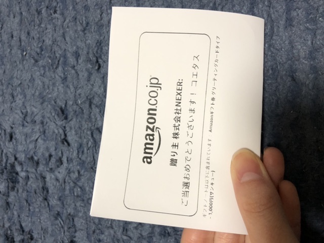 初めてコエタスさんで当選しました! 当選たものは、Amazonさんのギフト券。 届いたギフト券はカード付...