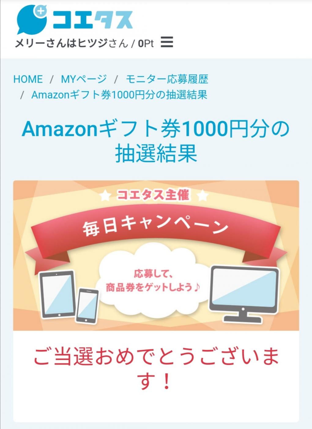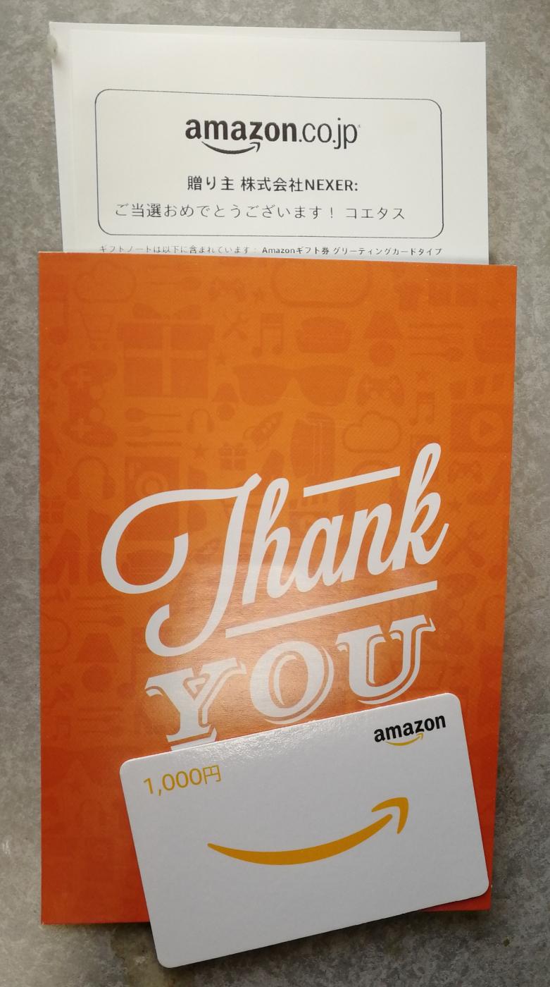 初めてコエタスさんで当選しました! 当選たものは、Amazonさんのギフト券。 届いたギフト券はカード付...