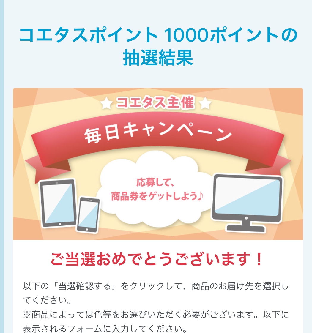 最近は育休中で自宅で出来るポイントサイトなど登録していってるうちにコエスタにたどり着きました。正直聞いたことがなかったのですが、本当に当選してポイントもすぐついてとってもお得だと思いました!