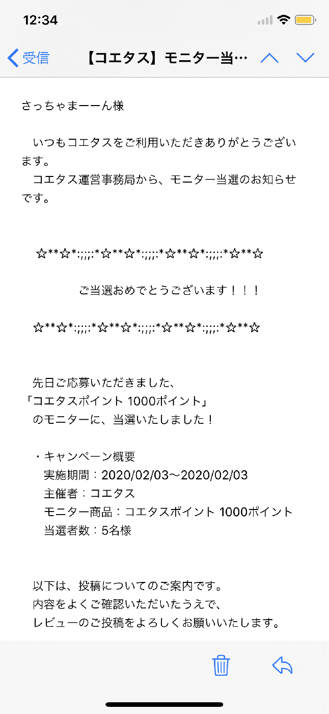 登録してそのまま応募したポイントキャンペーン、ほんとに当選しましたー!!!