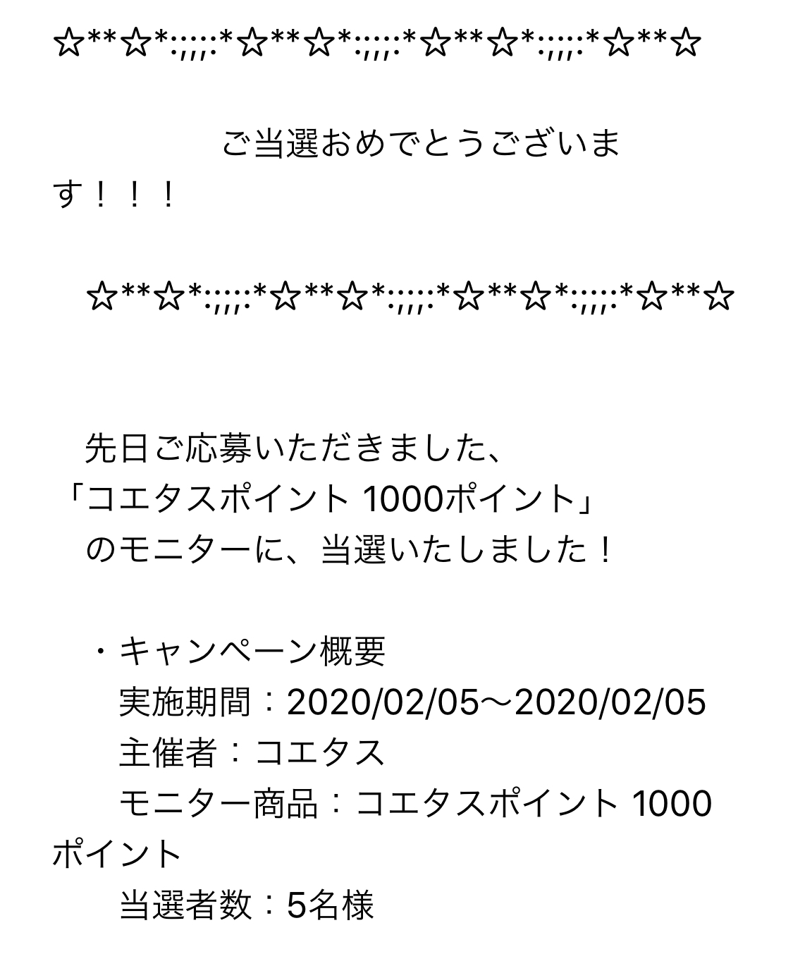 コエタスを始めて数日。 1回は落選したものの、2回目の応募でなんと!1000ptキャンペーンに当選しました...