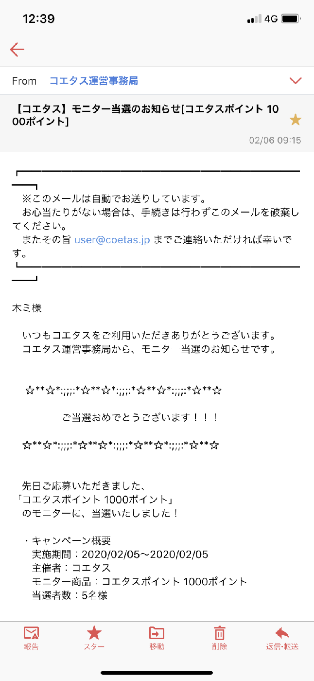 当選ありがとうございます。 コエタスに登録した日に応募しました。 1日5名ということで当選しないだ...