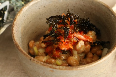 卵かけごはん、もやしのナムル・きゅうりのゴマ和え・わかめスープなど