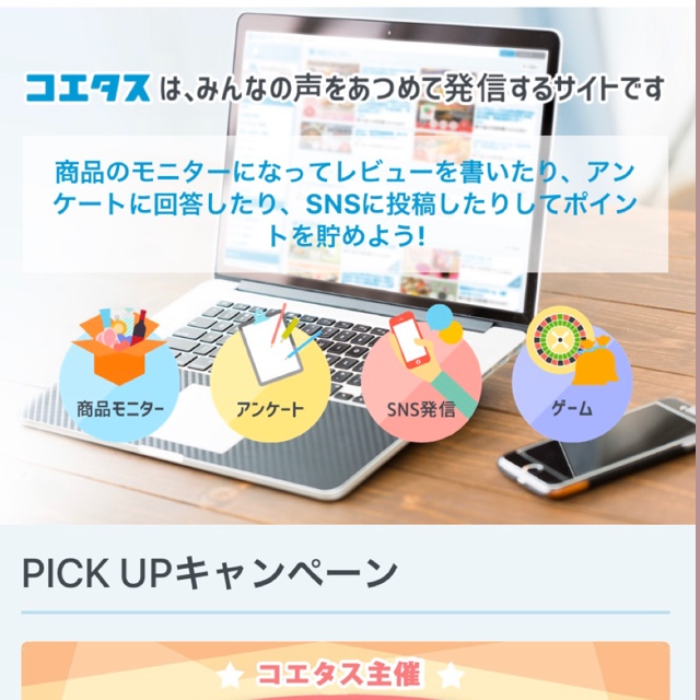 コエタスは、登録無料でモニター応募できて、SNSへのレビュー投稿でポイントが貯まる仕組み。